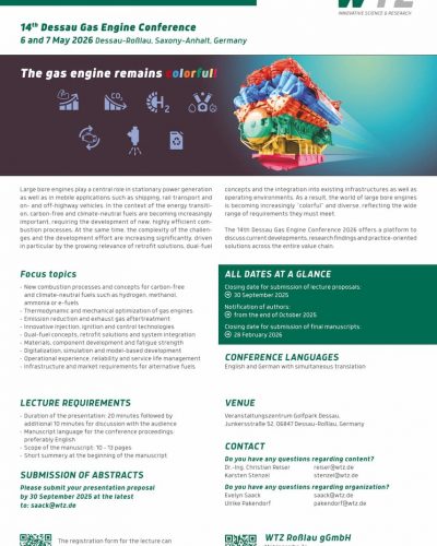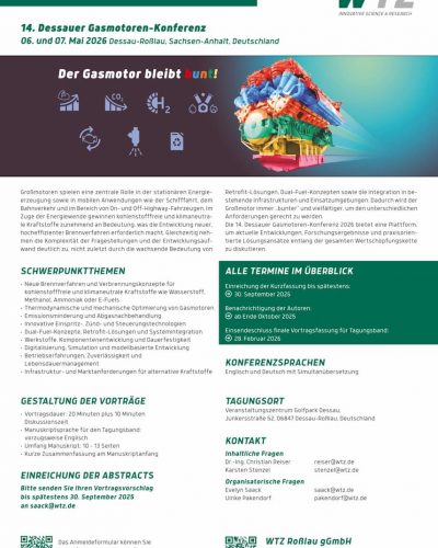 Die 14. Dessauer Gasmotoren-Konferenz 2026 bietet eine einzigartige interdisziplinäre Plattform zum Austausch aktueller Forschungsergebnisse, praxisnaher Lösungsansätze und strategischer Perspektiven entlang der gesamten technologischen Kette – von der Brennstoffversorgung bis zur Systemeinbindung.